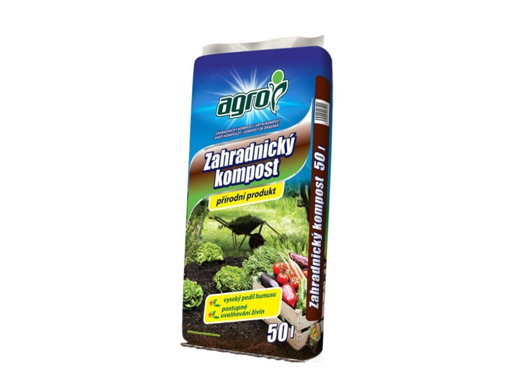 AGRO Zahradnický kompost s vysokým obsahem humusu je 100% přírodní materiál sloužící k základnímu hnojení venkovních záhonů, do skleníků a při výsadbě okrasných ovocných stromů. Dodává půdě živiny a organickou hmotu a tvoří tak úrodnější a kypřejší půdu. Zahradnický kompost je organické hnojivo a obsahuje pouze přírodní látky vzniklé zkompostováním surovin rostlinného původu s přídavkem dolomitického vápence.